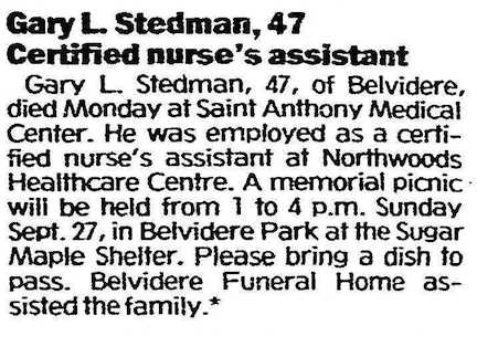 Born 7 Jun 1945, the son of Mr and Mrs. Murrl H. Stedman. Married Nancy L. Crawford on 16 July 1966 in Boone Co, Illinois. Twin daughters, Karon and Sharon, born 12 Feb 1968 in Belvidere. Died 14 September 1992 in Rockford, Winnebago, Illinois.